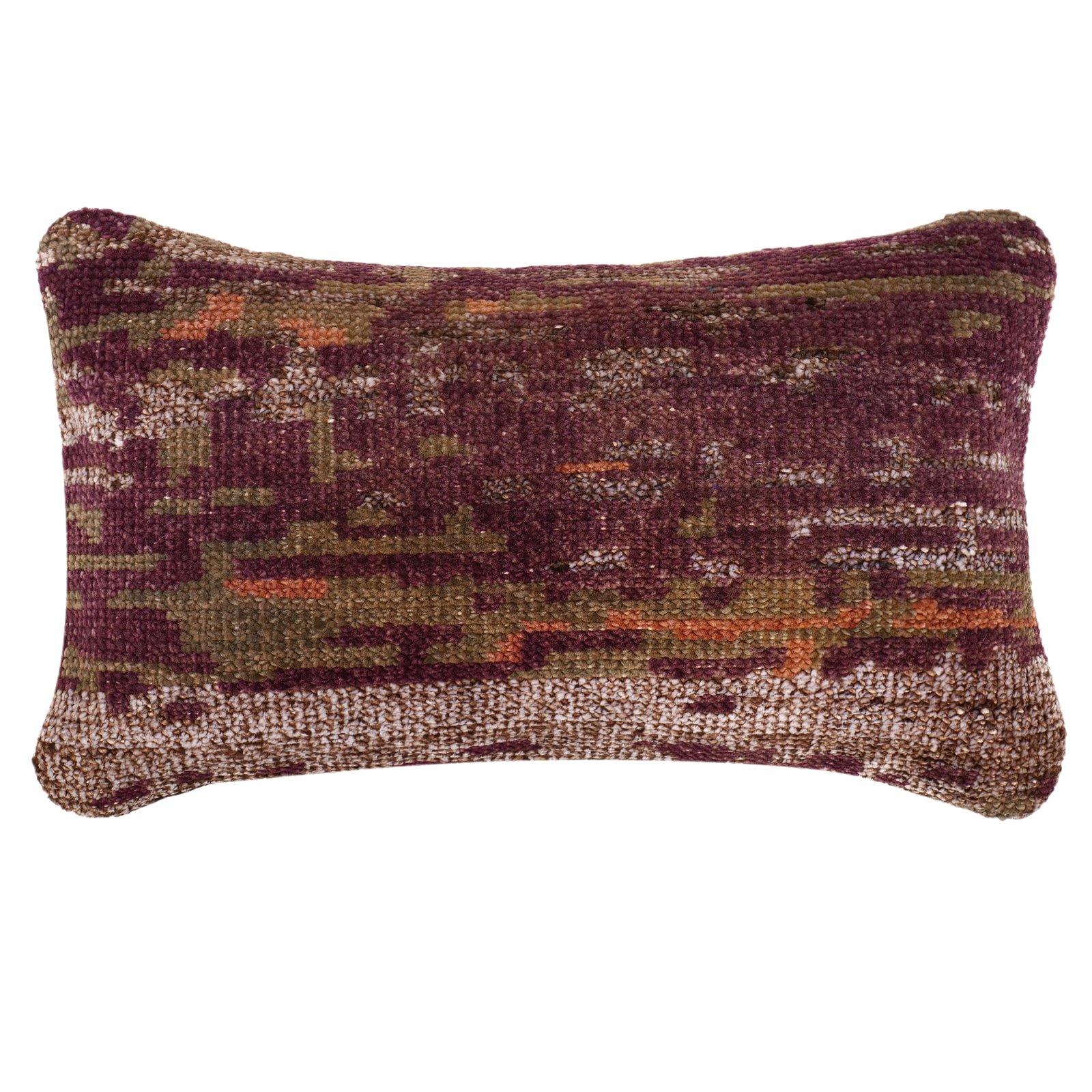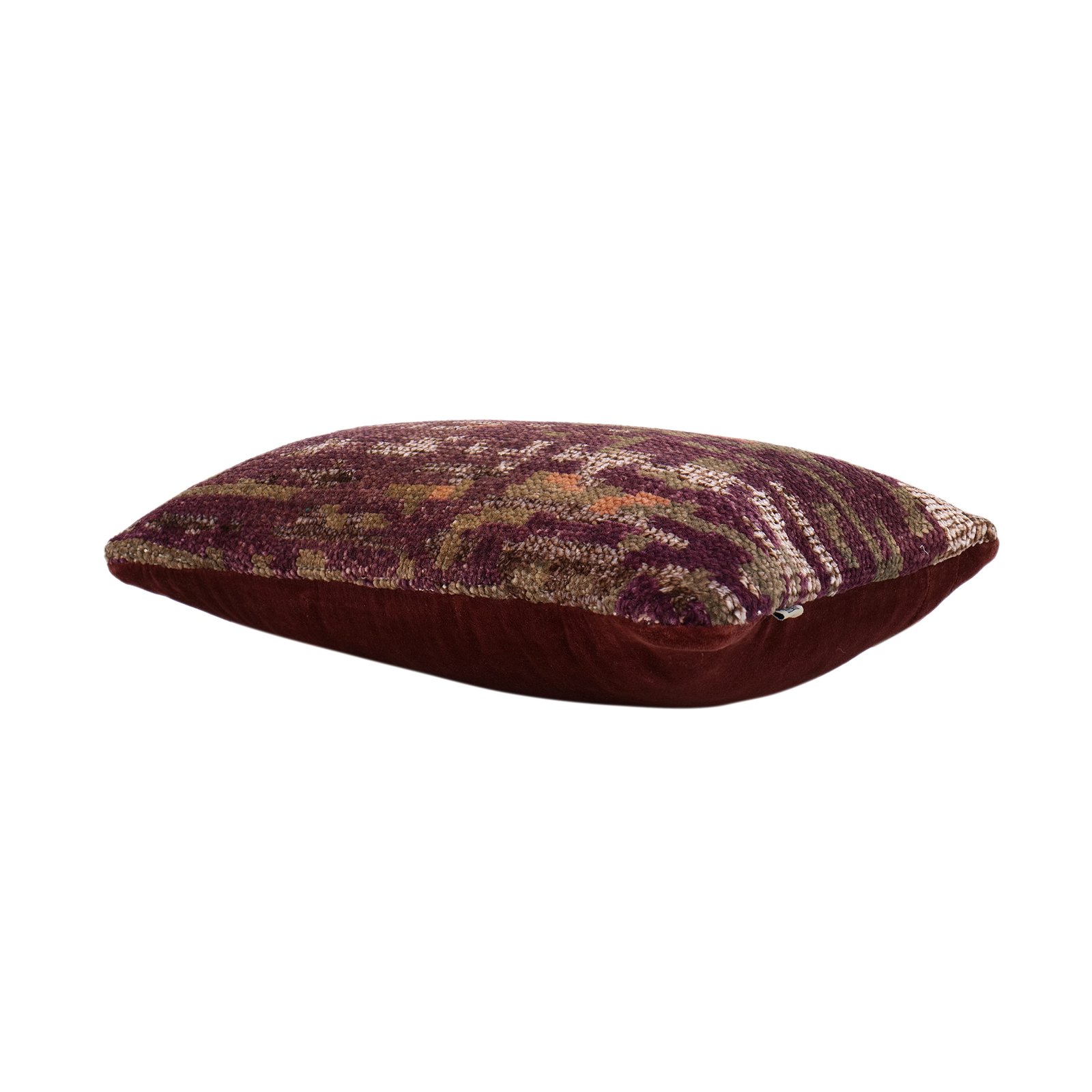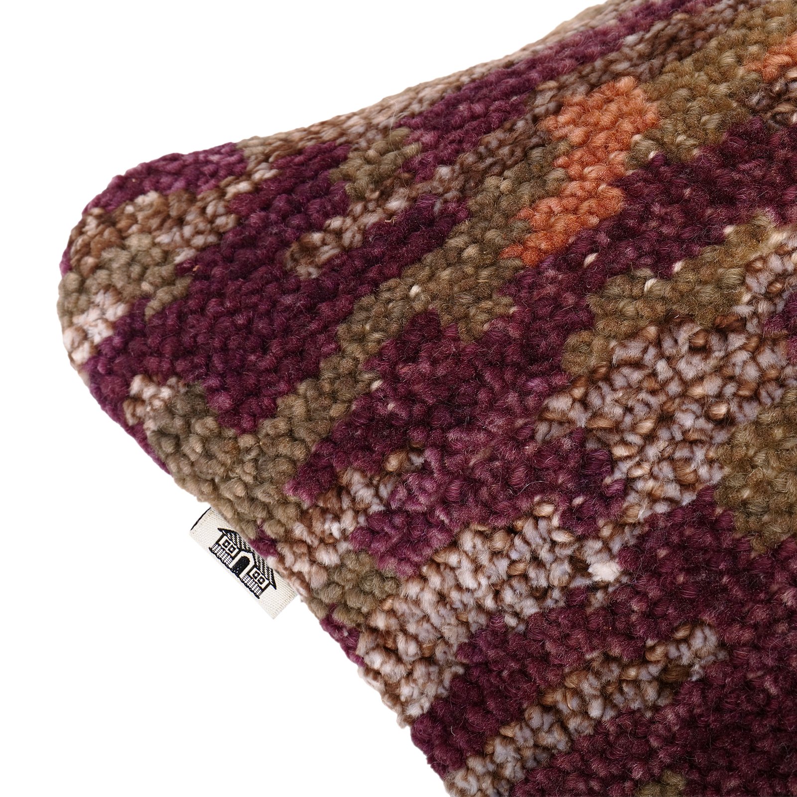 This stunning cushion cover perfectly blends artisanal craftsmanship and contemporary design, featuring a dynamic interplay of aubergine and sea foam colors. Adorned with a hand-knotted woolen carpet, the reverse side is finished in soft, luxurious velvet for a plush and comfortable feel.