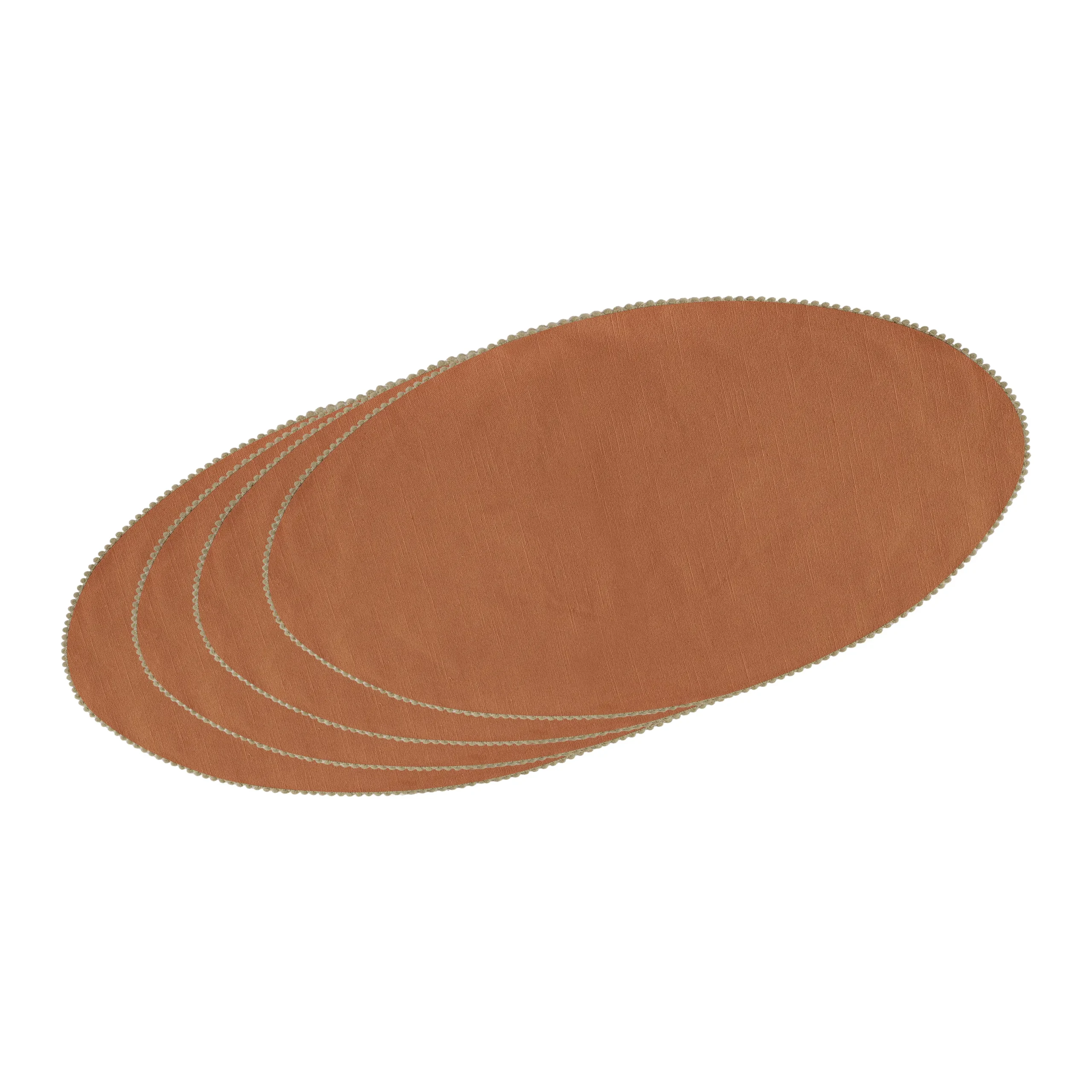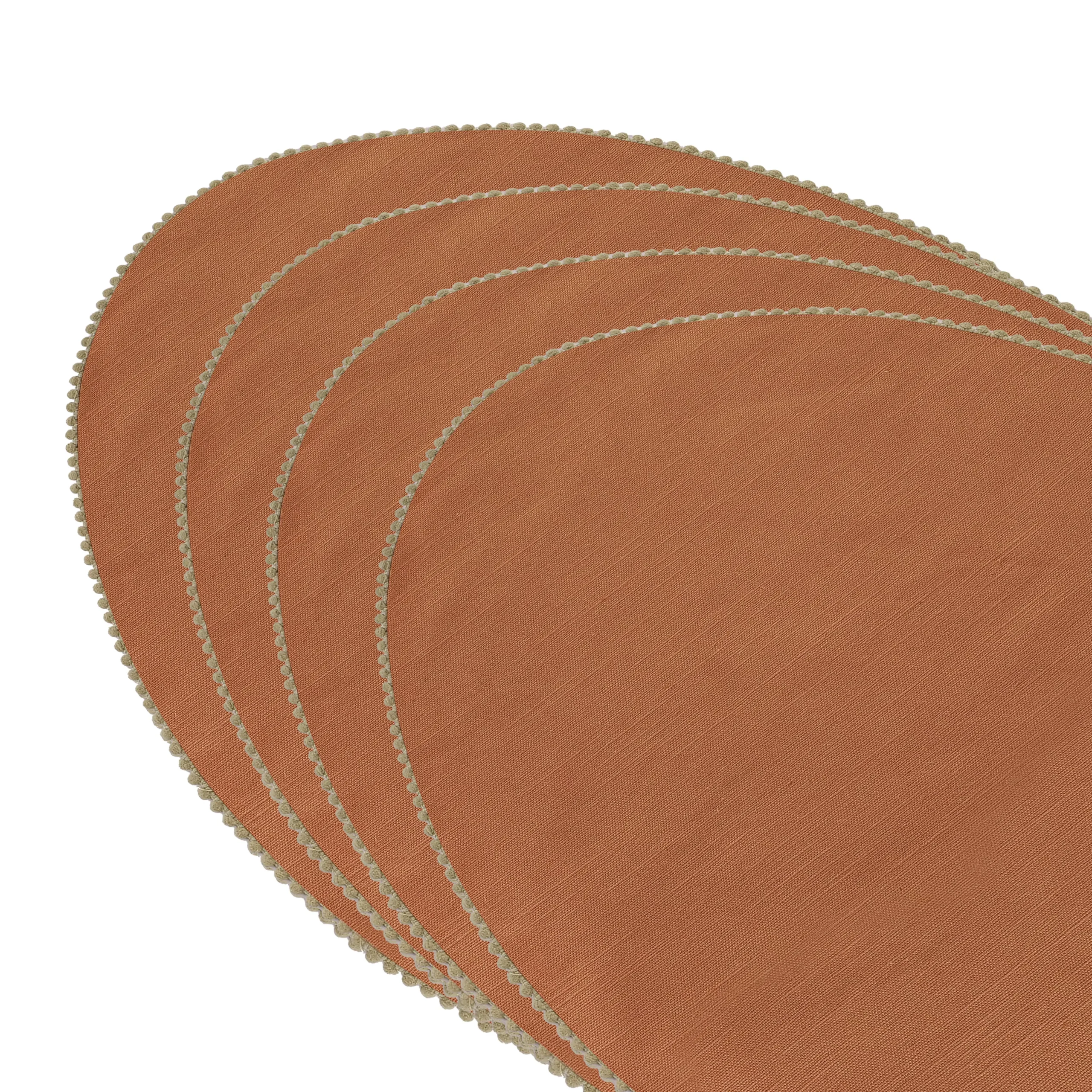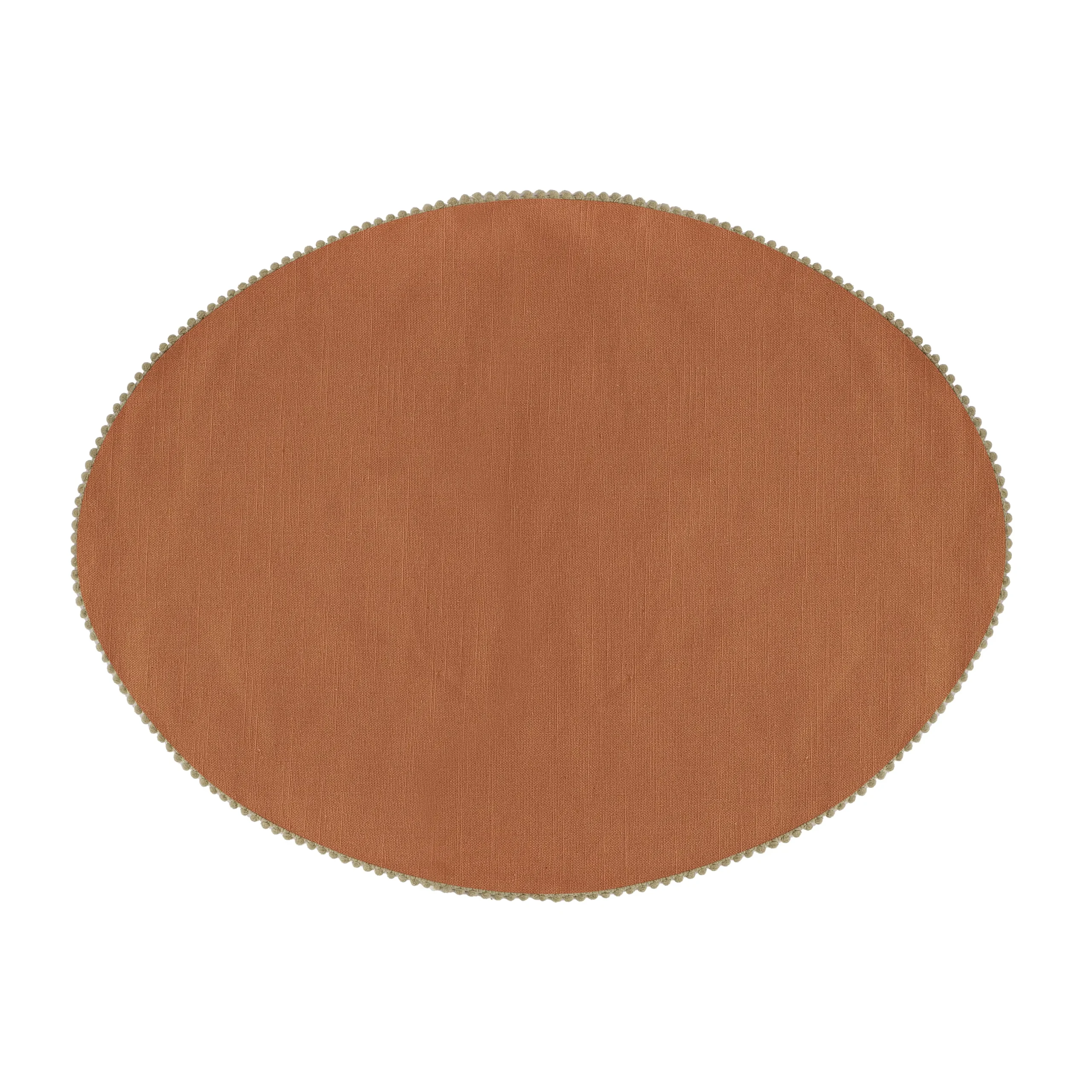 This elegant placemat features a warm, earthy terracotta hue in pure cotton, finished with a refined pom pom lace for subtle texture. Warm and versatile, it boasts a refined oval shape, ideal for enhancing both everyday and formal dining settings.